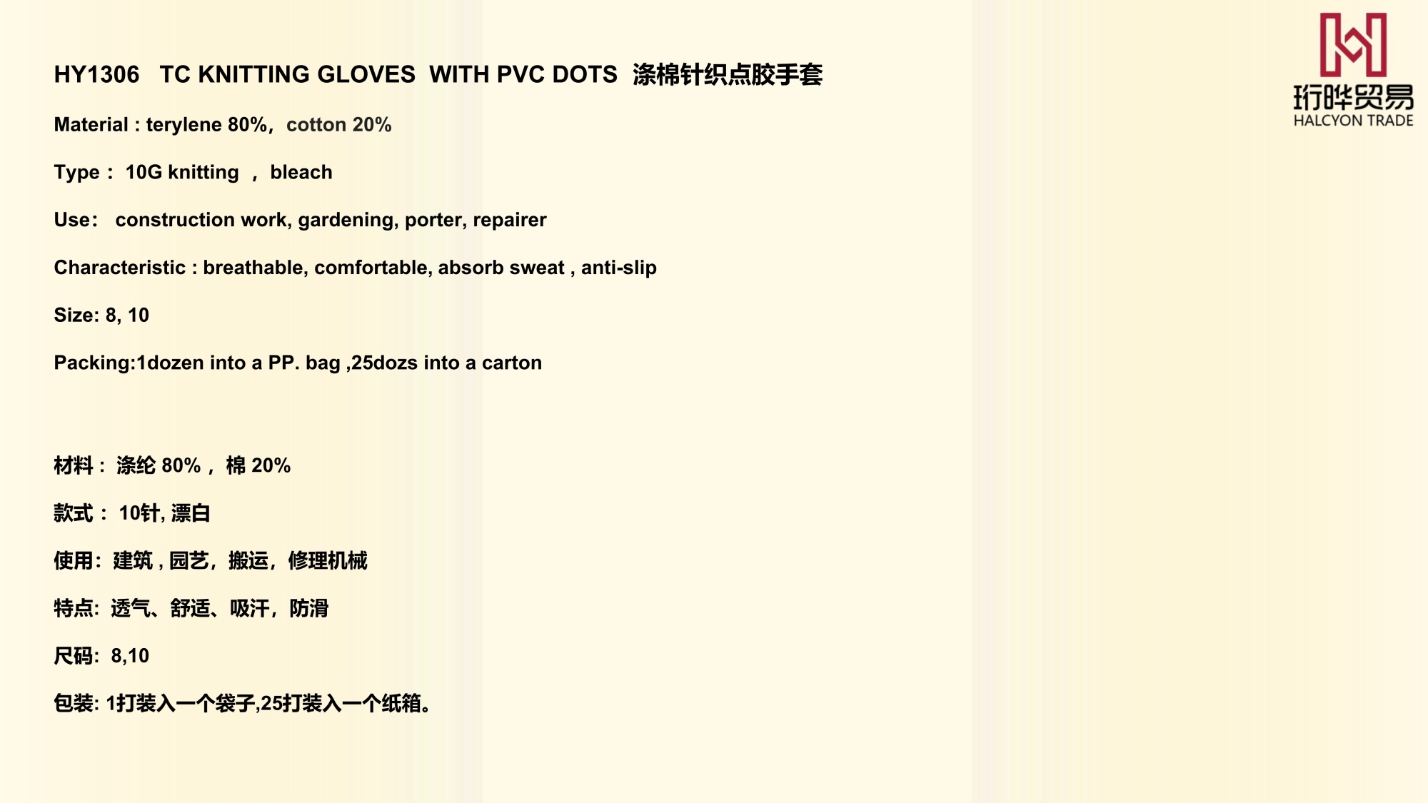 HY1306 涤棉针织点胶手套